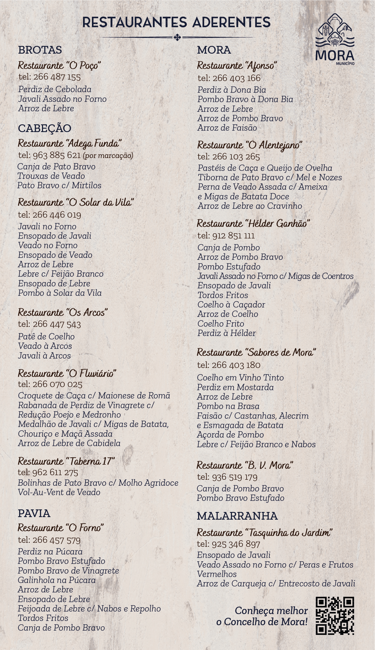A saber, os restaurantes que este ano participam são os seguintes: O Poço, em Brotas, Solar da Vila, Os Arcos, O Fluviário, Taberna 17 e Adega Funda, em Cabeção; Afonso, Hélder Ganhão, Sabores de Mora, O Alentejano, Bombeiros, em Mora; Tasquinha do Jardim, em Malarranha; O Forno, em Pavia.