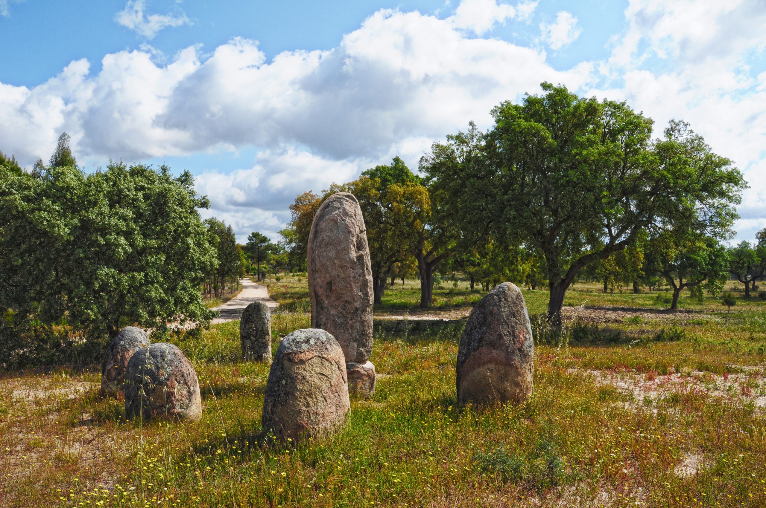 Descrição: O recinto das Fontainhas foi identificado pela equipa dos Serviços Geológicos de Portugal. A descoberta foi publicada em 1977, num artigo que mencionava a existência de seis menires, quatro dos quais in situ, um quinto monólito tombado e o sexto, o maior de todos e que se situava ao centro, partido junto à base e igualmente tombado. A campanha de escavações realizada em 2005 por Manuel Calado e Leonor Rocha, teve como objectivo avaliar o seu estado de conservação, recolher informação científica e proceder ao seu restauro. Um ano depois, todos os menires foram recolocados na sua posição original. Este recinto faz parte de um pequeno conjunto de monumentos praticamente exclusivos do Alentejo Central, tanto pela sua raridade como pela sua antiguidade e encontra-se classificado como Imóvel de Interesse Público desde 1990.